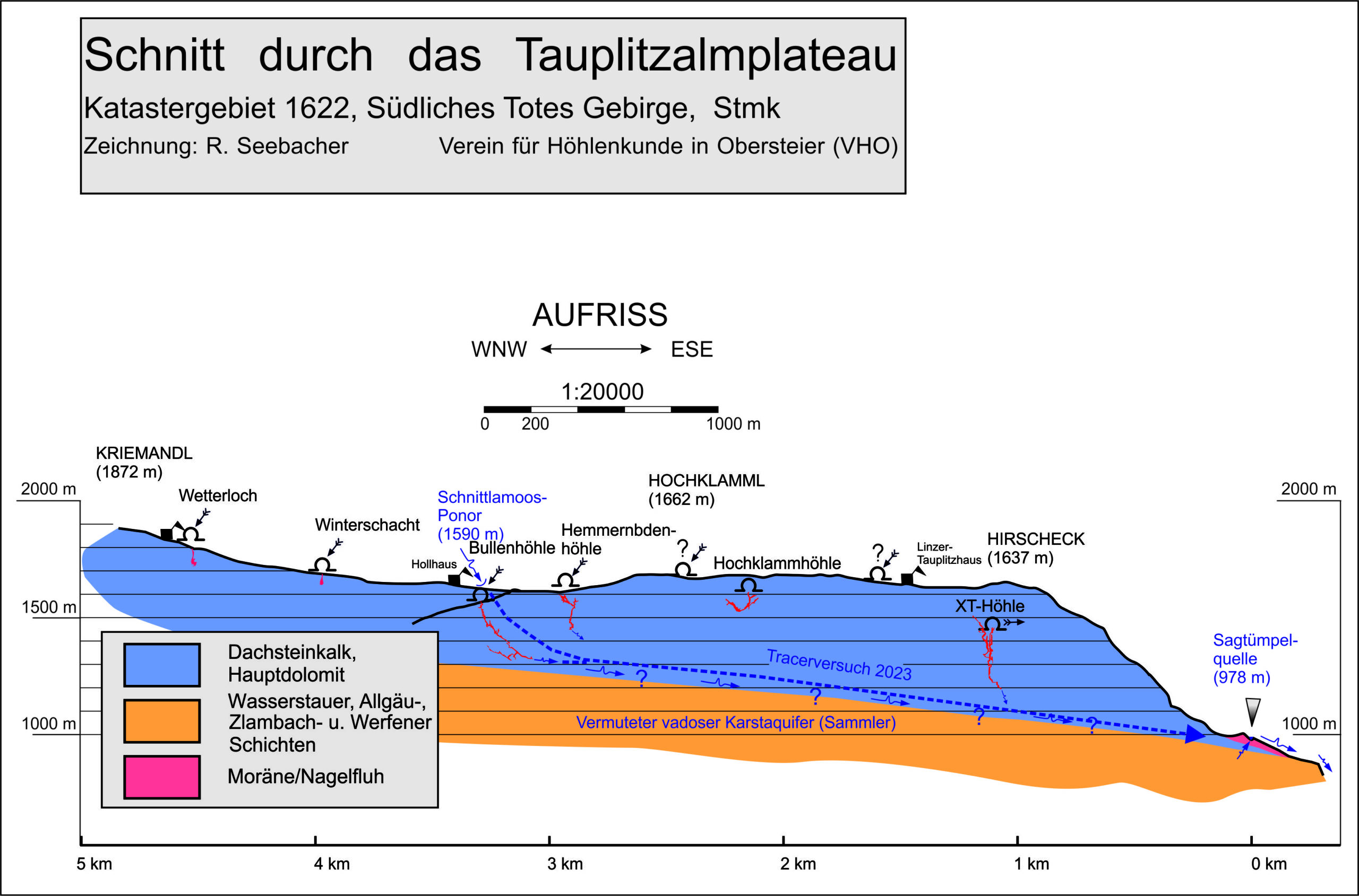 Weitere Indizien für das Vorhandensein einer großen Höhle sind zahlreiche schneefreie Stellen und „Blaslöcher“ am gesamten Plateau. Tracerversuche ergaben Durchgangszeiten von einer rund 3,6 km entfernten Schwinde zum Sagtümpel in nur wenigen Stunden. Auch dies deutet auf großlumige vadose Wasserwege hin.